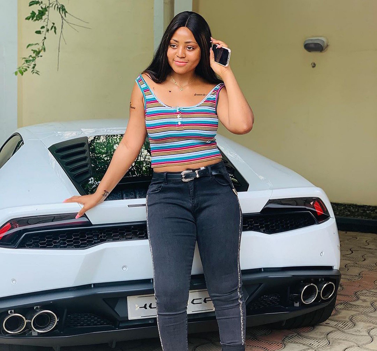 Seen on Regina Daniels instagram. She takes pictures standing with a car assumed to be Ned Nwoko’s Bugatti.