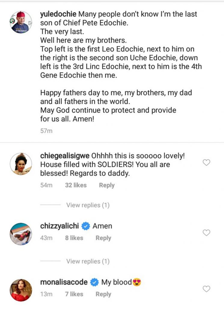 Top left is the first Leo Edochie, next to him on the right is the second son Uche Edochie, down left is the 3rd Linc Edochie, next to him is the 4th Gene Edochie then me.