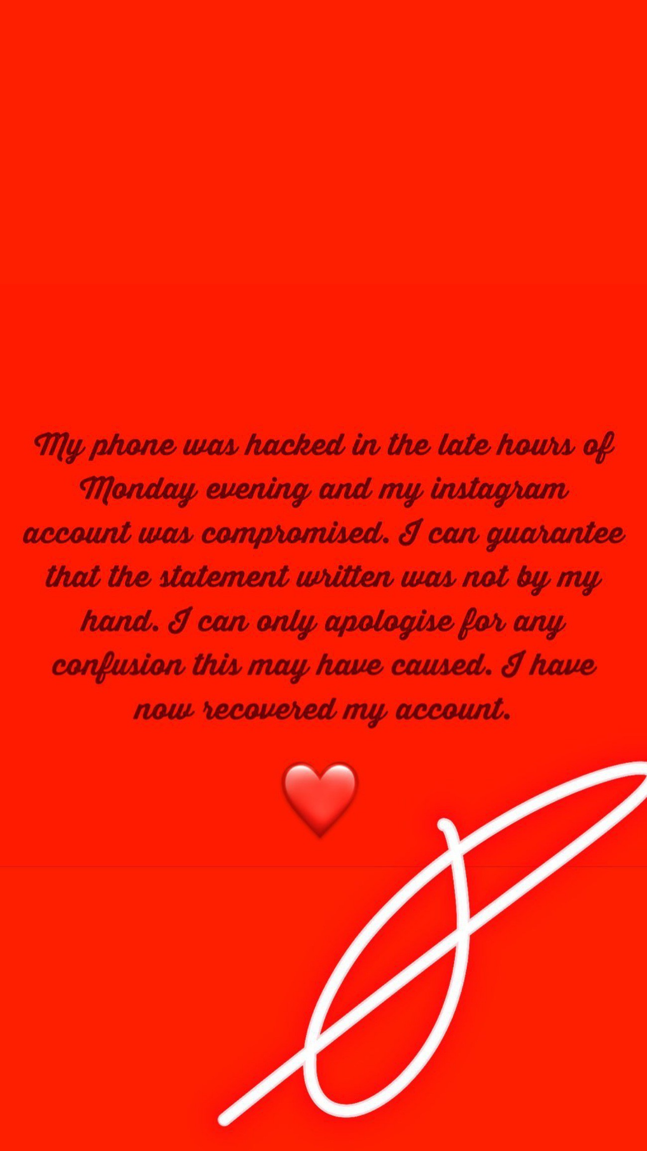 Also, she said that her instagram account was compromised but now, the account has been taken care of.