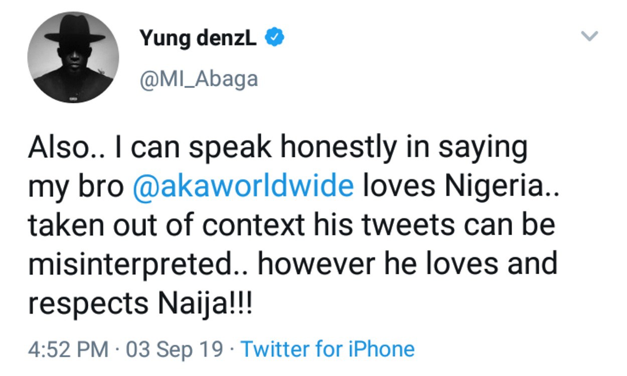 Moreover, Nigerian award winning rap star, M.I. Abaga has recently stood for AKA. According to him, the tweets from SA rapper was clearly misinterpreted, stating that AKA really loves Nigeria.