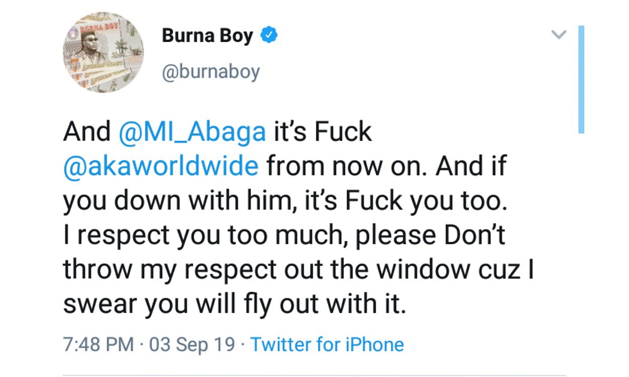 Mr Abaga’s support for AKA can say to have just sparked up more fire from Nigerian celebrities like Vector, Ice Prince, Burna Boy among others as they have just tweeted a response to M.I. stating how disappointed they are.