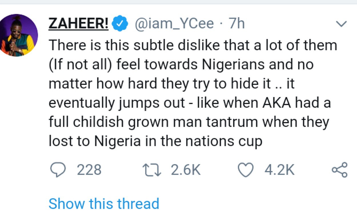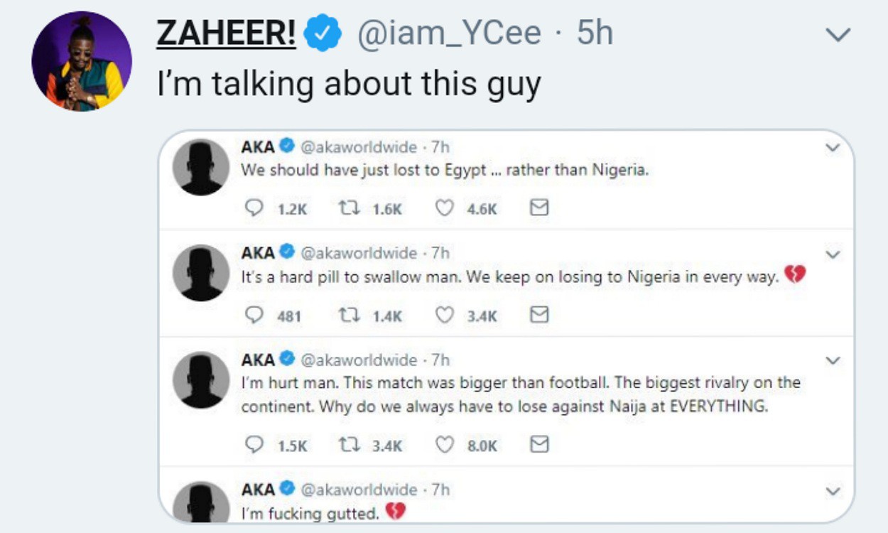 Recall a tweet by South African rapper, AKA about Bafana Bafana, South African football team loosing to Nigeria in the 2019 Africa Cup of Nation. Those tweets have been hitting on so many Nigerians’ head as to why a public figure like AKA had that to say against Nigeria.