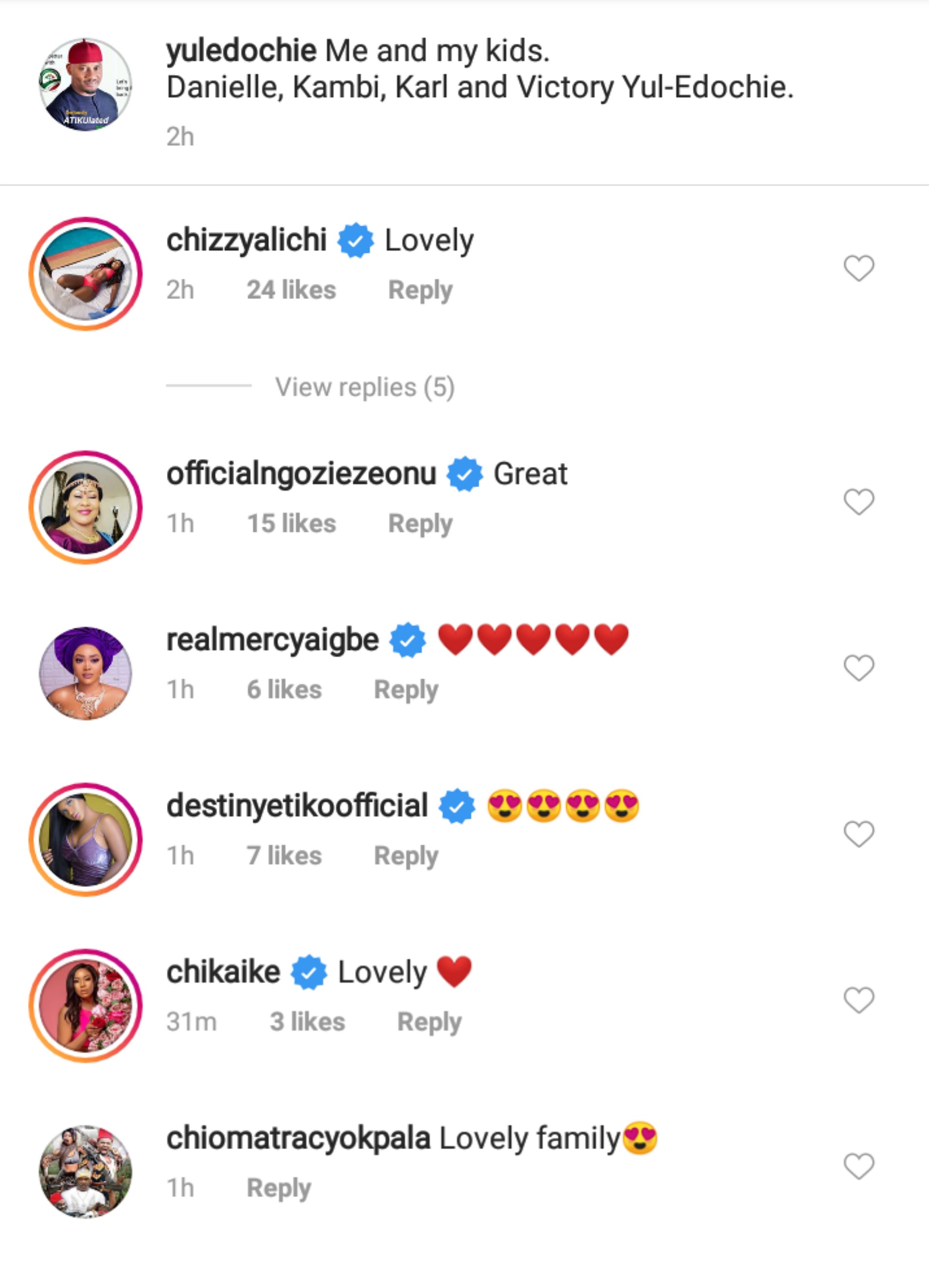 Proud father and the son of Nollywood veteran actor, Pete Edochie listed in a caption, the names of his four kids. According to his caption, their names are, Danielle, Kambi, Karl and Victory Yul-Edochie.