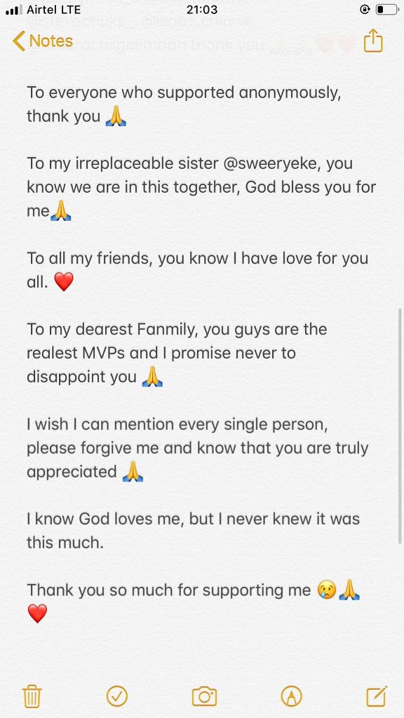 She however, thanks them for their financial support especially those who sent in money for votes and for those who shared her pictures and voting formats on social media.