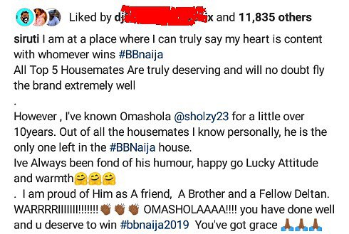 Uti however, said that Omashola has really done well in the house as he’s fond of his humour and happy-go warmth attitude. “He deserve to win”, Uti wrote.