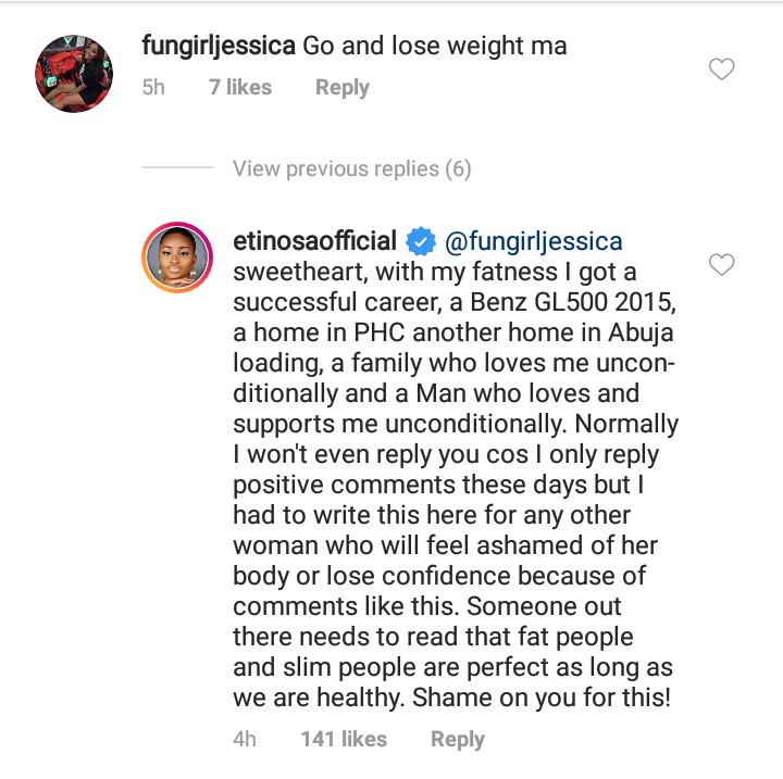 However, Etinosa took to the reply and told the lady that with her fatness, she got a successful career, a Benz, a home in Port Harcourt and a new home set to come in Abuja as well as family and a man who loves and supports her unconditionally.