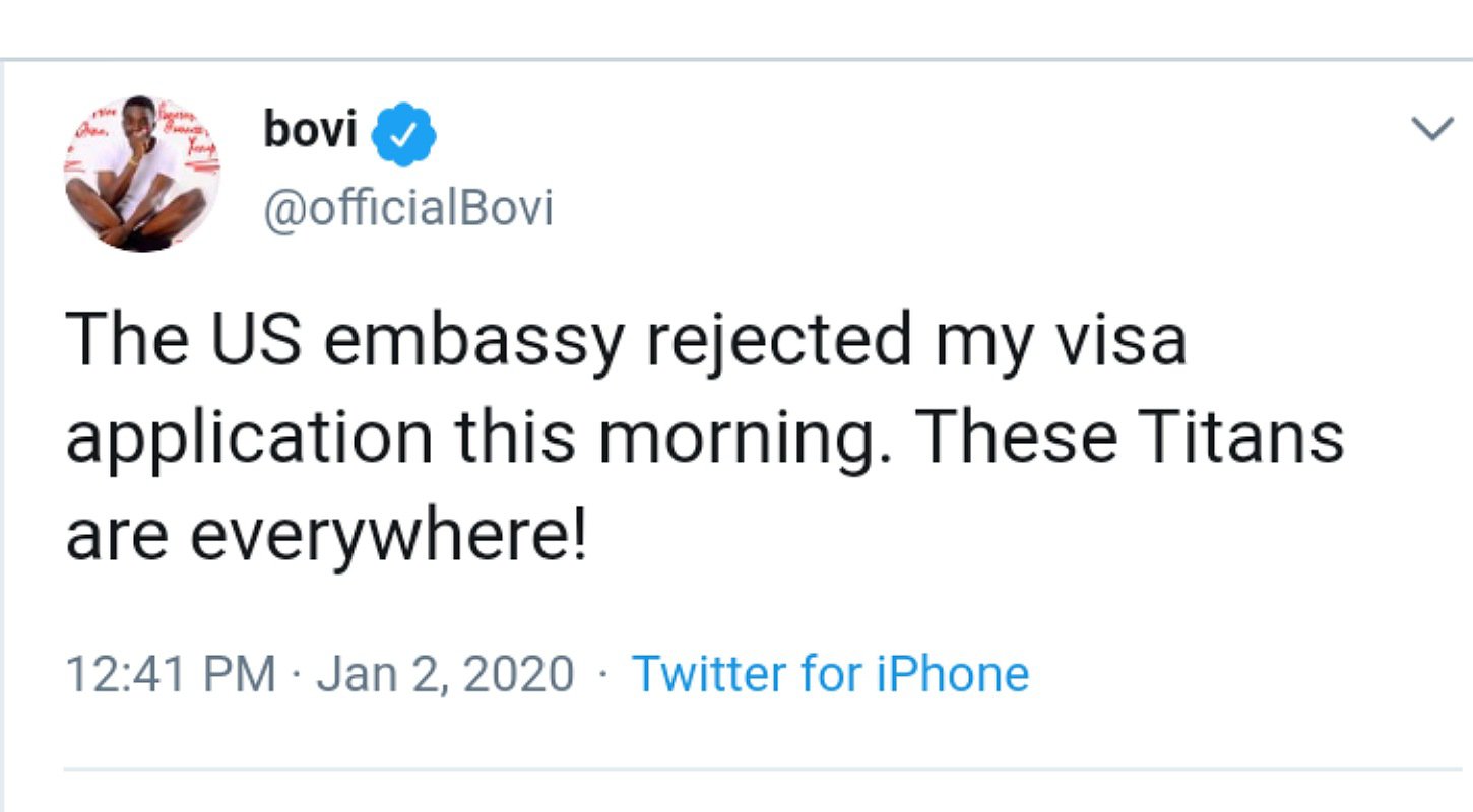 So, Bovi shared a tweet on his Twitter page today January 2, 2020 stating that he’s been denied visa application at the U.S. Embassy and he suspects Tacha’s fans who he said are everywhere.