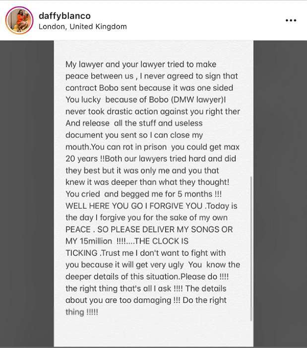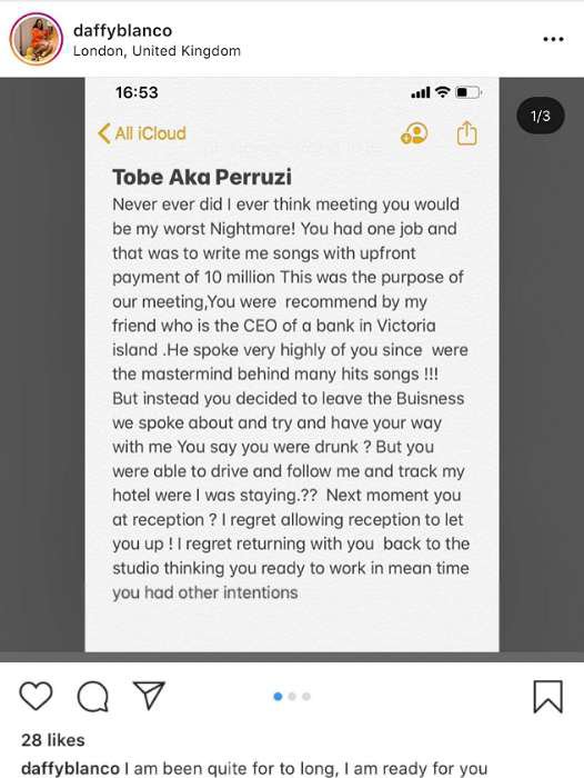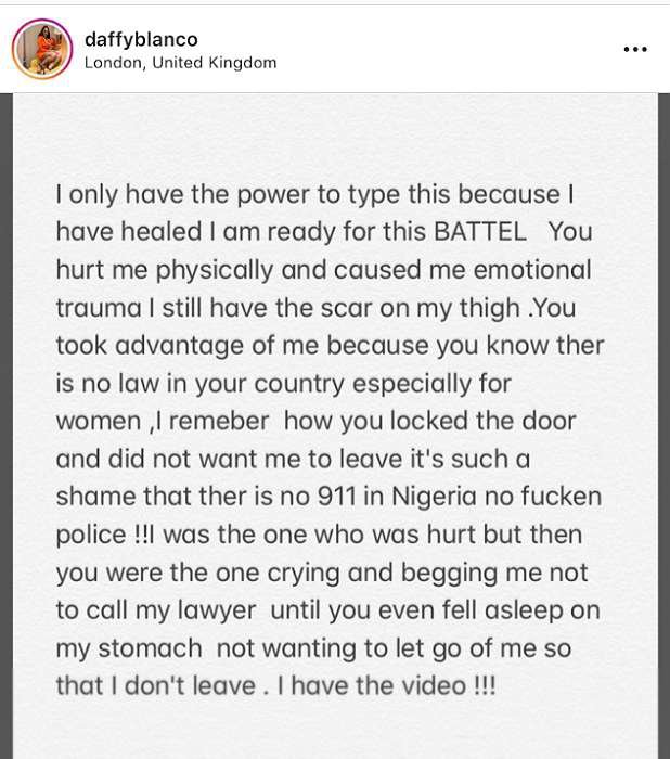 Ranging from rape to fraud, Daffy stated that Peruzzi took advantage of her after they agreed he’ll be writing songs for her.