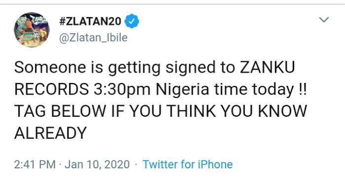 The news broke out few hours after Zlatan tweeted on his micro-blogging platform that someone is about to be signed into Zanku Records. “Someone is getting signed to ZANKU RECORDS 3:30pm Nigeria time today!! TAG BELOW IF YOU THINK YOU KNOW ALREADY”, he wrote.