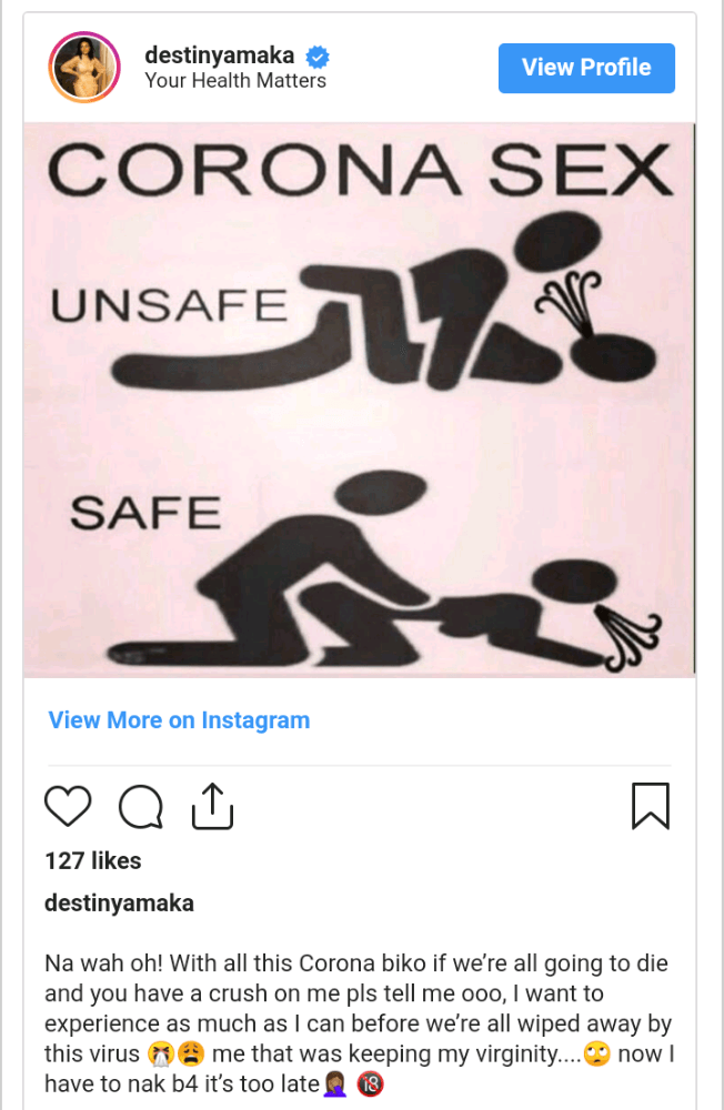 “With all this Corona biko if we’re all going to die and you have a crush on me pls tell me ooo, I want to experience as much as I can before we’re all wiped away by this virus me that was keeping my virginity…. now I have to nak b4 it’s too late”, she wrote.