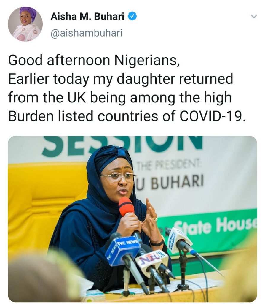 Aisha used the tweets to encourage Nigerians to be self-conscious and avoid exposure to the spiraling pandemic as she had already shut her office down for two weeks.