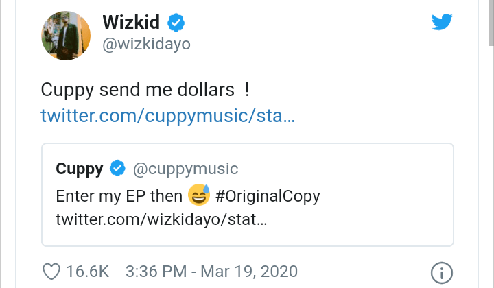Popular Nigerian music honcho, Ayo Balogun, easily identified as Wizkid, has asked his fast rising industry colleague, Disc Jockey, artist and business magnet, Femi Otedola‘s daughter, DJ Cuppy to send him dollars before he could be part of her project, “Original Copy”, her debut EP.