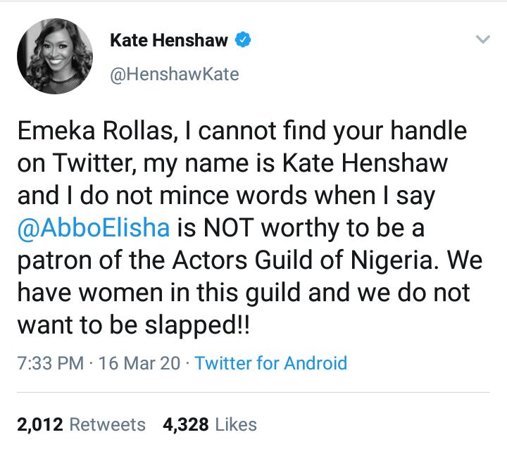 Emeka Rollas, I cannot find your handle on Twitter, my name is Kate Henshaw and I do not mince words when I say @AbboElisha is NOT worthy to be a patron of the Actors Guild of Nigeria. We have women in this guild and we do not want to be slapped!!