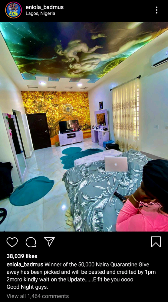 “Winner of the 50,000 Naira Quarantine Give away has been picked and will be pasted and credited by 1pm 2moro kindly wait on the Update……E fit be you oooo