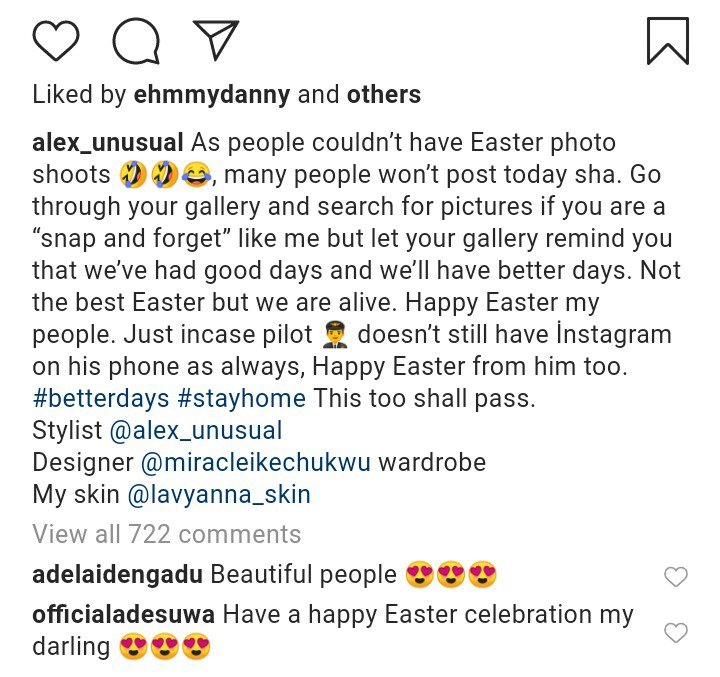 “As people couldn’t have Easter photo shoots, many people won’t post today sha. Go through your gallery and search for pictures if you are a “snap and forget” like me but let your gallery remind you that we’ve had good days and we’ll have better days. Not the best Easter but we are alive. Happy Easter my people. Just incase pilot doesn’t still have İnstagram on his phone as always, Happy Easter from him too. #betterdays #stayhome This too shall pass.”