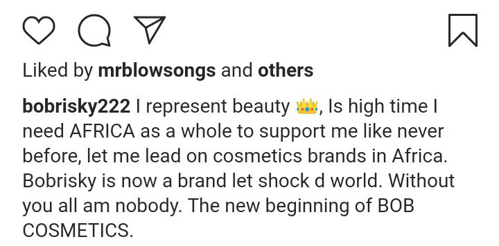 “I represent beauty, Is high time I need AFRICA as a whole to support me like never before, let me lead on cosmetics brands in Africa. Bobrisky is now a brand let shock d world. Without you all am nobody. The new beginning of BOB COSMETICS.”