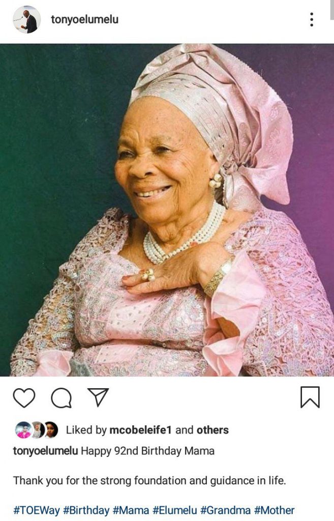 Nigerian foremost business tycoon and philanthropist, Tony Onyemaechi Elumelu celebrates his lovely mother, Suzanne Elumelu as she turns 92 years today, April 24, 2020.