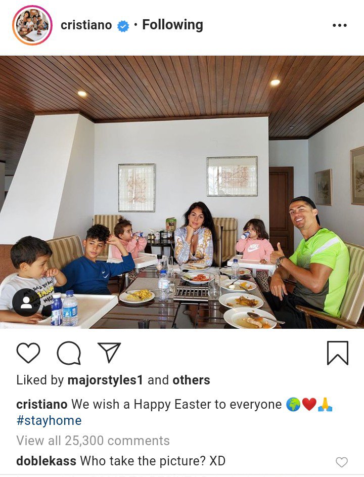 Today, Sunday, April 12, 2020, CR7 shared a photo on his Instagram page which showed him, wife and four kids having a very commendable dinning moment. And when looked closely, you could observe how happy everyone seems.