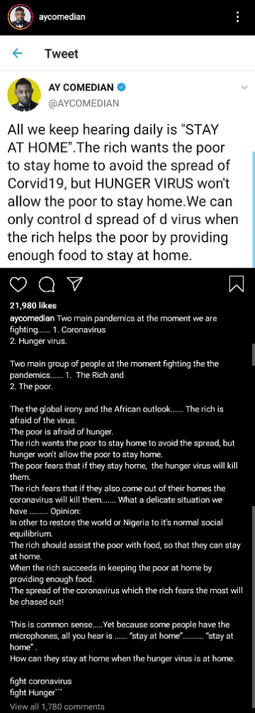 AY is of the opinion that the rich are scared of the Coronavirus and want the poor to stay at home to prevent further spread of the virus they so much dread, while the poor can’t stay at home comfortably because there’s “hunger virus” at home.