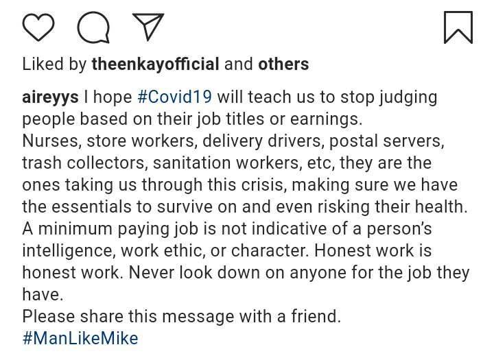 “I hope #Covid19 will teach us to stop judging people based on their job titles or earnings. Nurses, store workers, delivery drivers, postal servers, trash collectors, sanitation workers, etc, they are the ones taking us through this crisis, making sure we have the essentials to survive on and even risking their health. A minimum paying job is not indicative of a person’s intelligence, work ethic, or character. Honest work is honest work. Never look down on anyone for the job they have. Please share this message with a friend.”