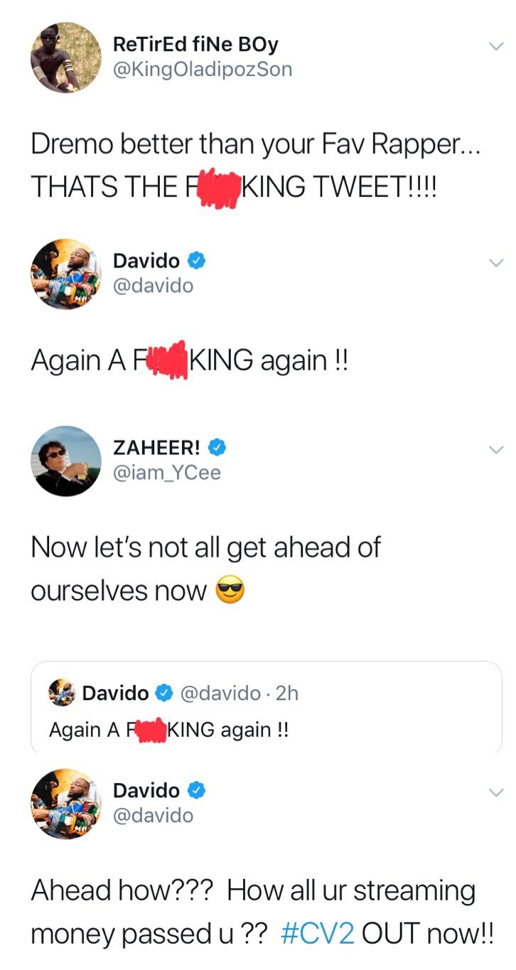 However, Davido retweeted @KingOladipozSon‘s tweet in appreciation, telling the fan to say it “Again f**king again”. Then after, Ycee came with a retweet from Davido’s post saying that we shouldn’t get ahead of ourselves (and this meant that Davido shouldn’t hype and talk about Dremo like there are no other good rappers like Ycee) “Now let’s not all get ahead of ourselves”, Ycee noted.