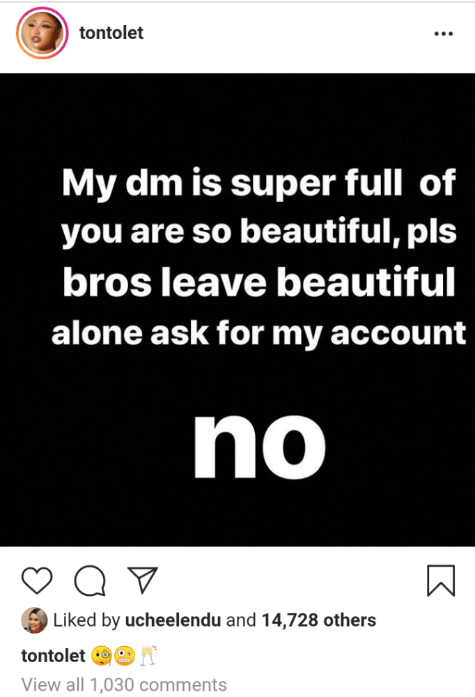 “My DM is super full of you’re beautiful, pls bros leave beautiful alone, ask for my account no.”