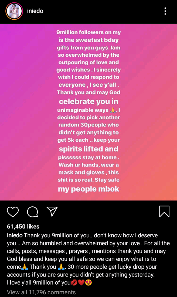 “Thank you 9million of you.. don’t know how I deserve you .. Am so humbled and overwhelmed by your love . For all the calls, posts, messages , prayers , mentions thank you and may God bless and keep you all safe so we can enjoy what is to come Thank you. 30 more people get lucky drop your accounts if you are sure you didn’t get anything yesterday.