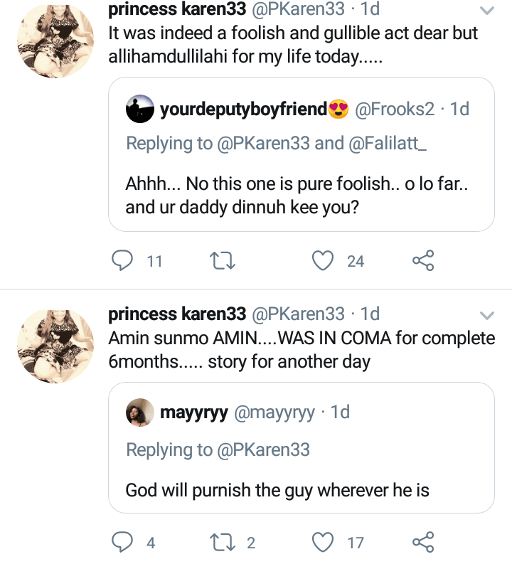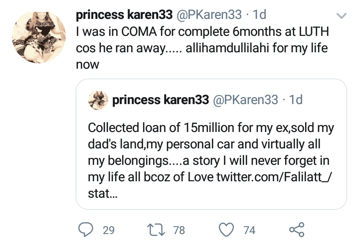 In response to Falilatt’s tweet and question above, Karen took to the microblogging platform, Twitter, to narrate her pitiable story of how she collapsed and went into coma after she learnt her ex-boyfriend ran away with a whopping 15 million naira loan she allegedly collected for him out of love.