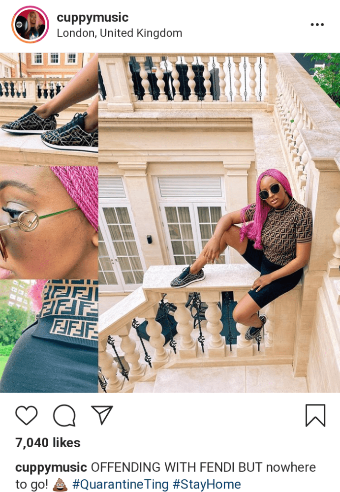 Taking to her page on Instagram, DJ Cuppy who is apparently tired of staying at home all day, shared a cool photo of herself, and revealed she dressed up in an all-Fendi attire but sad enough, couldn’t go out.