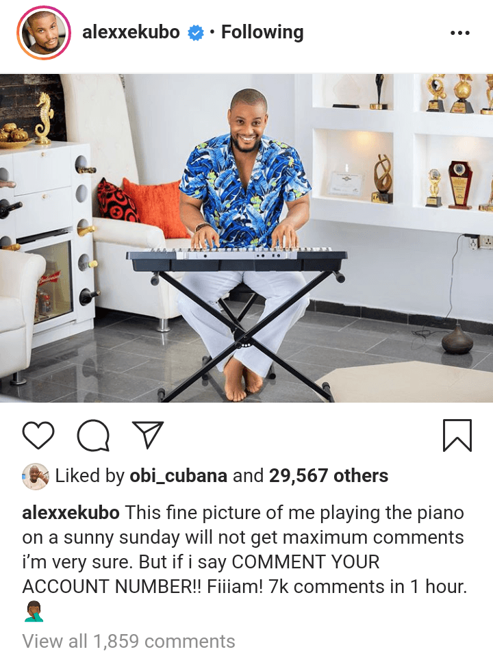 “This fine picture of me playing the piano on a sunny sunday will not get maximum comments i’m very sure. But if i say COMMENT YOUR ACCOUNT NUMBER!! Fiiiam! 7k comments in 1 hour. 🤦🏾♂️”