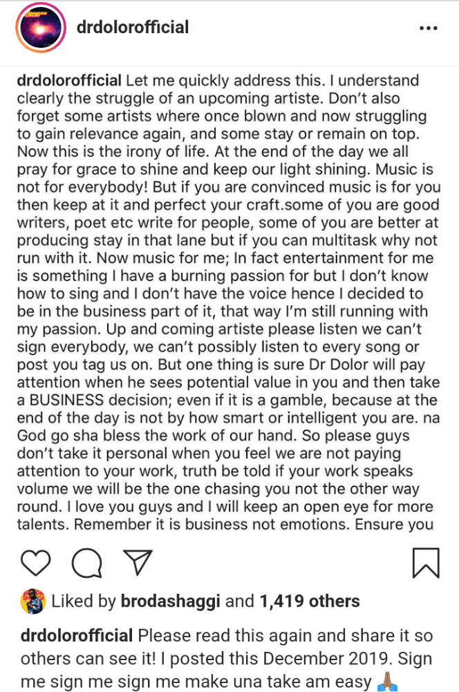“Please read this again and share it so others can see it! I posted this December 2019. Sign me sign me sign me make una take am easy” he captioned his post.