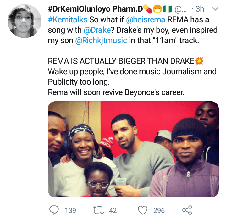 Controversial Nigerian journalist, Kemi Olunloyo has said that there is no fuse about fast rising Nigerian artist, Rema featuring Canadian rapper, Drake.