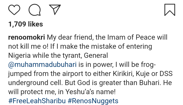 “My dear friend, the Imam of Peace will not kill me o! If I make the mistake of entering Nigeria while the tyrant, General @muhammadubuhari is in power, I will be frog-jumped from the airport to either Kirikiri, Kuje or DSS underground cell. But God is greater than Buhari. He will protect me, in Yeshu’a’s name! #FreeLeahSharibu #RenosNuggets”