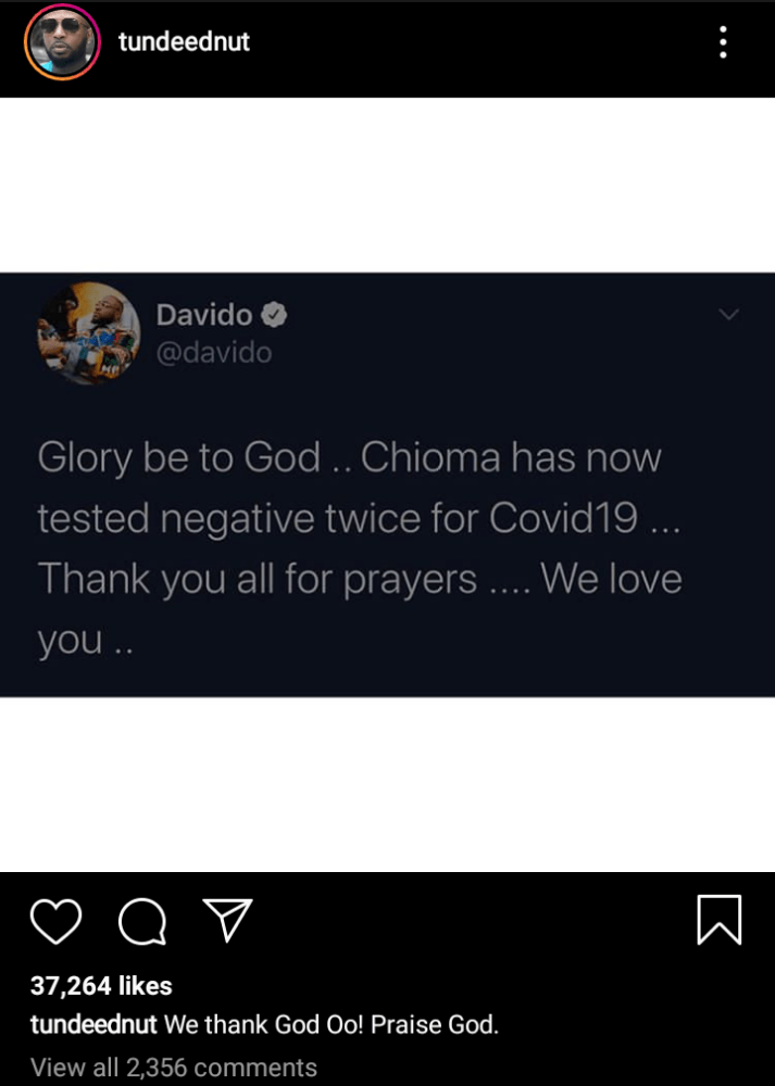 A Nigerian man has reacted to news on Davido‘s fiancée, Chioma‘s recovery from Coronavirus.