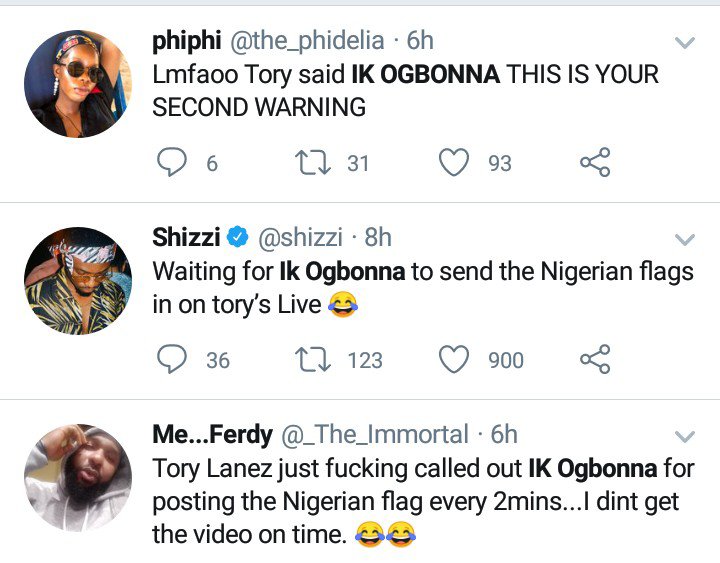 He consistently shared Nigerian flag emojis on the comment section which got Tory annoyed, making him to warn IK to stop posting same thing.