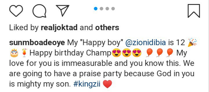 “My “Happy boy” @zionidibia is 12. Happy birthday Champ. My love for you is immeasurable and you know this. We are going to have a praise party because God in you is mighty my son. #kingzii”