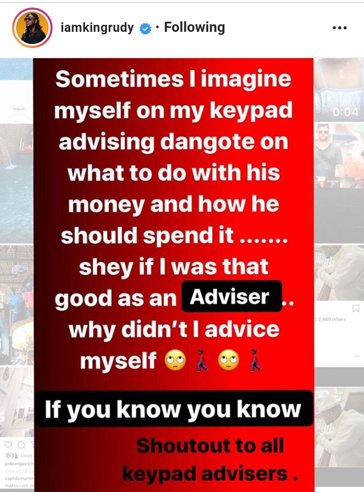 “Sometimes, I imagine myself on my keypad advising Dangote on what to do with his money and how he should spend it. Shey if I was that good as an Adviser… Why didn’t I advise myself… If you know you know… Shoutout to all keypad advisers.”