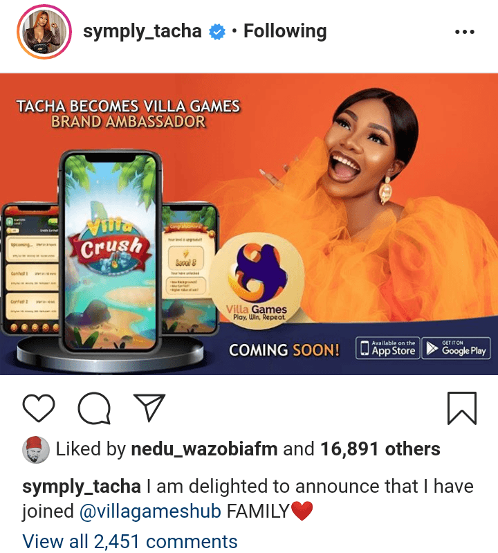 Former Big Brother Naija season 4 housemate, Natacha Akide, popularly known as Tacha, has bagged another hot ambassadorial deal with a games developing company, Villa Games.