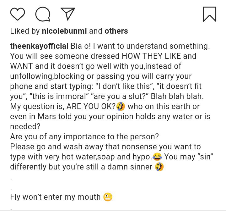 “Bia o! I want to understand something. You will see someone dressed HOW THEY LIKE and WANT and it doesn’t go well with you, instead of unfollowing,blocking or passing you will carry your phone and start typing: “I don’t like this”, “it doesn’t fit you”, “this is immoral” “are you a slut?” Blah blah blah. My question is, ARE YOU OK? who on this earth or even in Mars told you your opinion holds any water or is needed? Are you of any importance to the person? Please go and wash away that nonsense you want to type with very hot water,soap and hypo. You may “sin” differently but you’re still a damn sinner. Fly won’t enter my mouth”