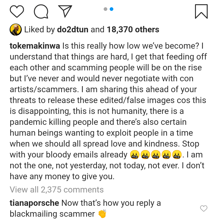 “I am sharing this ahead of your threats to release these edited/false images cos this is disappointing, this is not humanity, there is a pandemic killing people and there’s also certain human beings wanting to exploit people in a time when we should all spread love and kindness.
