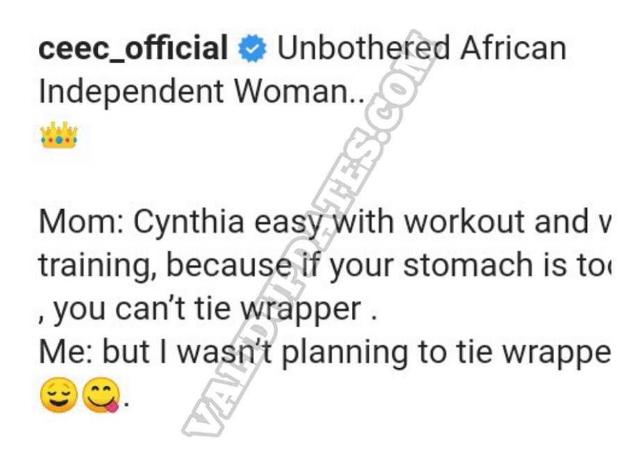 In caption, she was warned by her mom to reduce the rate at which she works out and trains her waist because her tommy is likely to get flat preventing her from tying wrapper. Then, Cee C responded that even as that, she wasn’t planning as woman to tie wrapper.