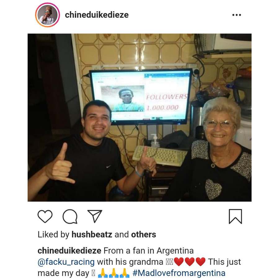 On Instagram, Chinedu, who is fondly called Aki shared a post which showed the fan pictured alongside his grandma in celebration of Aki’s 1 million followers.