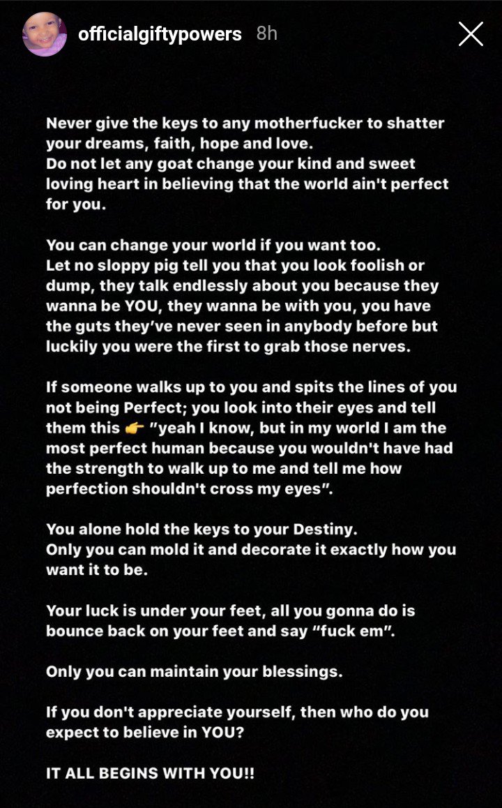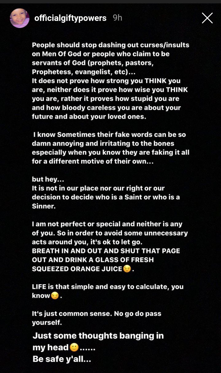Ex-Big Brother Naija reality Tv star, Gifty Powers has dished out some pieces of advice to Nigerians and her fans who have found it as a duty to rain insults on men of God.