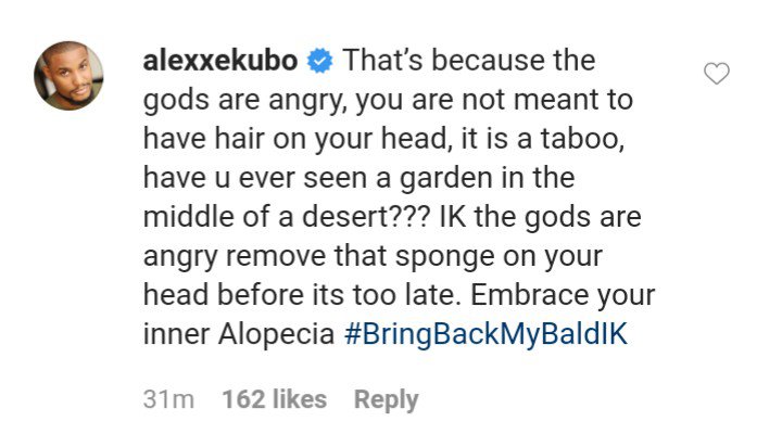 However, Alexx Ekubo who happens to be one of IK’s closest friends took to his comment section to slam him. He said that reason his wig produces white hairs is because the gods are angry.
