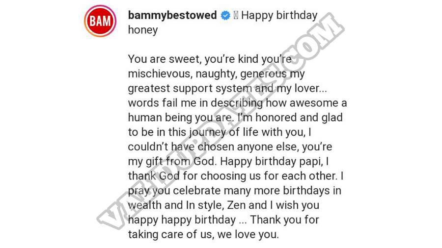 “You are sweet, you’re kind you’re mischievous, naughty, generous my greatest support system and my lover… words fail me in describing how awesome a human being you are. I’m honored and glad to be in this journey of life with you, I couldn’t have chosen anyone else, you’re my gift from God. Happy birthday papi, I thank God for choosing us for each other. I pray you celebrate many more birthdays in wealth and In style, Zen and I wish you happy happy birthday… Thank you for taking care of us, we love you.”