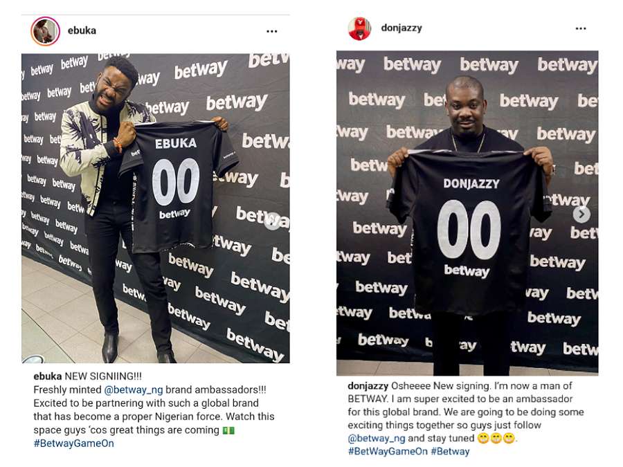 โNEW SIGNIING!!! Freshly minted @betway_ng brand ambassadors!!! Excited to be partnering with such a global brand that has become a proper Nigerian force. Watch this space guys โcos great things are coming #BetwayGameOnโ