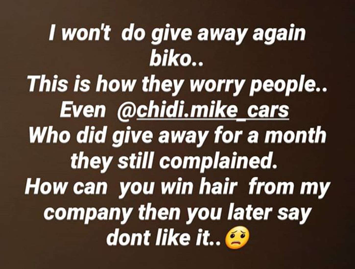 Big Brother Naija 2017 star, Uriel Ngozi Oputa has given up on surprising her fans with giveaway after a female fan rejected a wig worth N80,000.