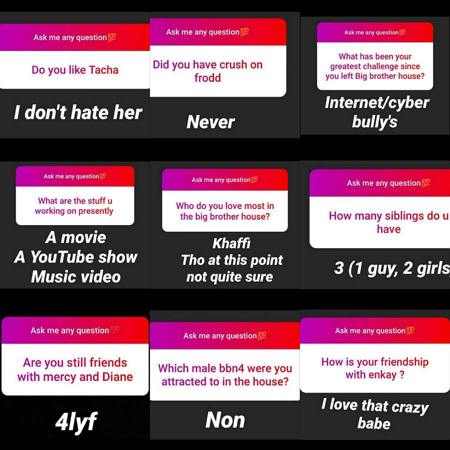 A fan asked if she likes Tacha and she responded saying that she doesn’t hate her either. And this answer goes in contrary to what happened sometimes during the Pepper Dem Reunion Show when Ebuka asked Cindy and her colleagues to put down name of the person they never vibed with in the house and she inked Tacha’s name.