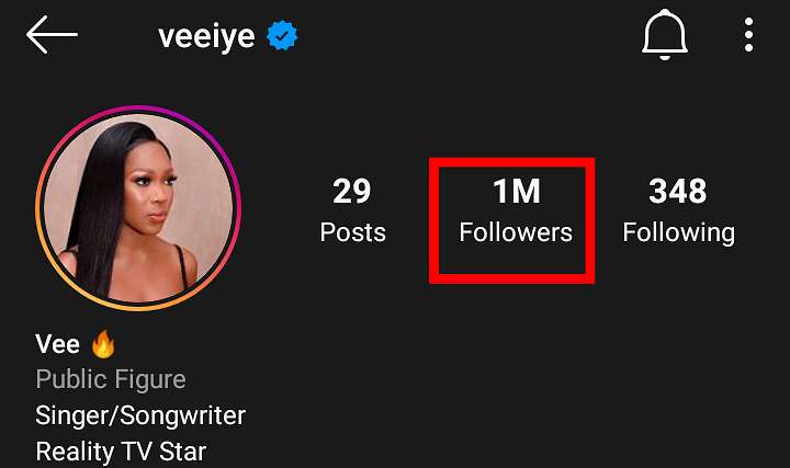 In a post shared by the reality TV star on her Twitter page, Sunday, November 15, Vee announced that she has garnered 1 million organic Instagram followers.
