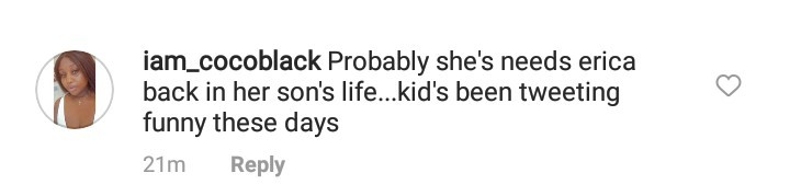 @iam_cocoblack, “Probably she’s needs erica back in her son’s life…kid’s been tweeting funny these days.